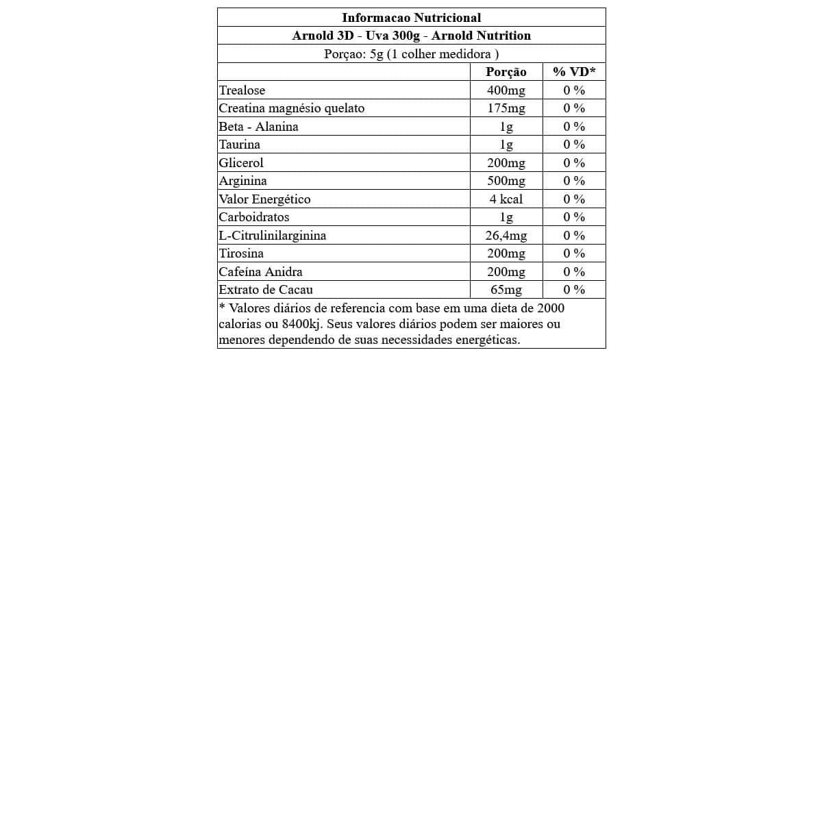 Fique mais disposto para treinar e obter grandes resultados. Arnold 3.D - 300 g é o mais novo lançamento da Arnold Nutrition. Com ele, o corpo passa a produzir uma sensação intensa de energia, atenção e concentração. Sua fórmula pré-treino é a mais forte do mercado e indicada para atletas de alta performance. Arnold 3D proporciona mais disposição para treinar, mais força e resistência, além de uma energia duradoura e efeito pump constante. Ao acelerar o metabolismo, a quebra e queima de gordura passa a ser mais intensa, ajudando na perda de gordura localizada.