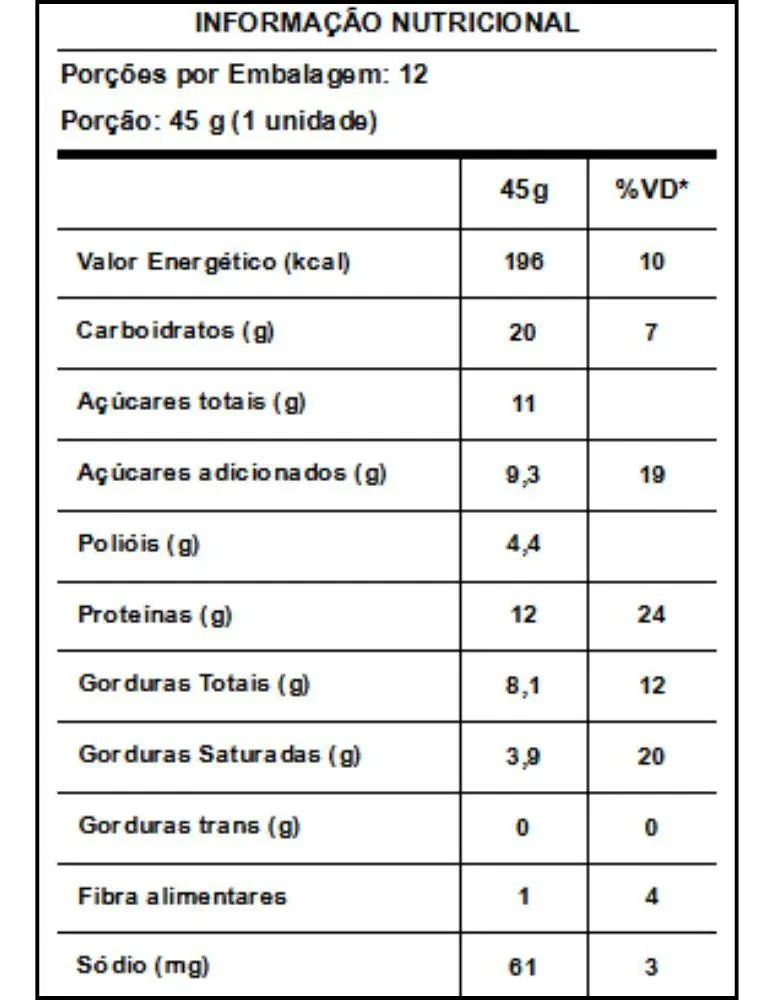 Saciedade prolongada: Combinação de proteínas e fibras ajuda a controlar a fome entre as refeições. Recuperação: Fornece proteína de qualidade no pós-treino. Energia para o dia: Ótima como snack pré-atividade física ou lanche energético. Ajuda a evitar exageros: Sabor doce que satisfaz a vontade de comer chocolate com mais equilíbrio. Estilo de vida ativo: Um aliado para quem quer se cuidar sem abrir mão do prazer ao comer. Contém derivados de leite, soja e glúten.