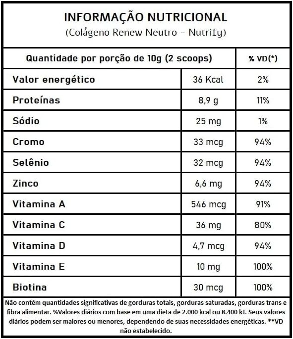 A firmeza e a sustentação de nossa pele estão diretamente relacionadas à produção de colágeno pelo organismo, que diminui progressivamente ao longo dos anos, ocasionando flacidez e outros sinais de envelhecimento. COLLAGEN RENEW NUTRIFY contém peptídeos bioativos de colágeno Verisol®, que ajudam a recuperar a firmeza dos tecidos, melhorando sua aparência. A fórmula limpa de COLLAGEN RENEW Nutrify – sem adição de açúcar, lactose, glúten, corantes e adoçantes artificiais – oferece ainda vitaminas e minerais antioxidantes que favorecem a absorção dos peptídeos e promovem o fortalecimento de unhas e cabelos.