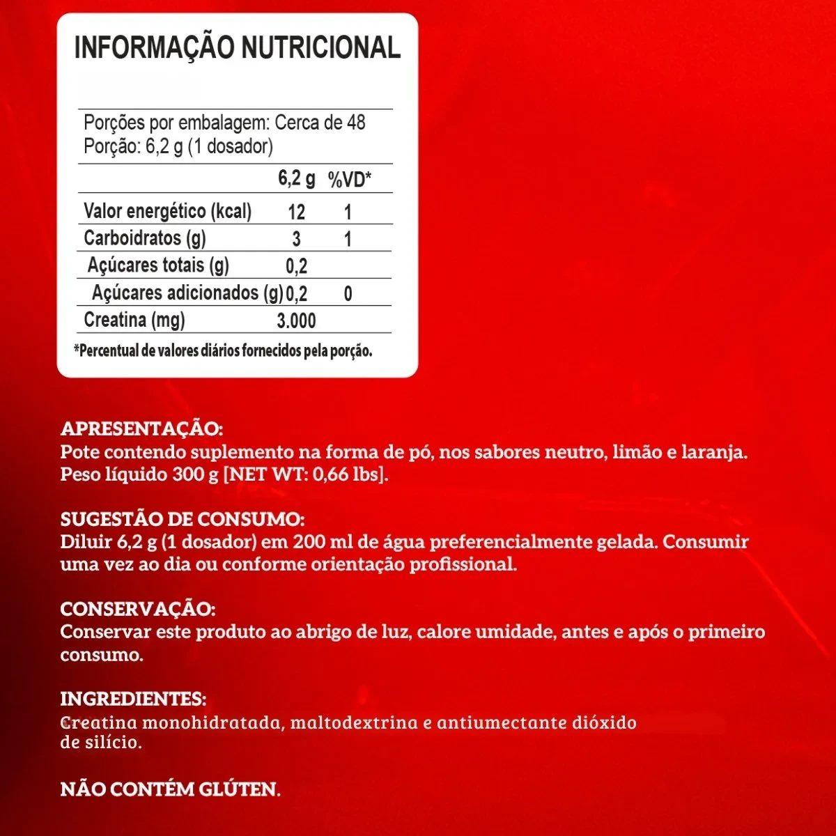 A Creatina Carbo Fuel da Integralmédica é um suplemento que auxilia no aumento dos estoques intramusculares de creatina. Isso é fundamental para a produção de energia, maior tolerância ao esforço e recuperação muscular. Cada dose fornece 3g de creatina e 3g de carboidratos. É um produto de lançamento, livre de gordura e sódio. Pode ser consumido a qualquer momento do dia, inclusive em dias de descanso, e não está associado à retenção hídrica na pele ou tecido adiposo, pois o aumento hídrico ocorre dentro da célula muscular.