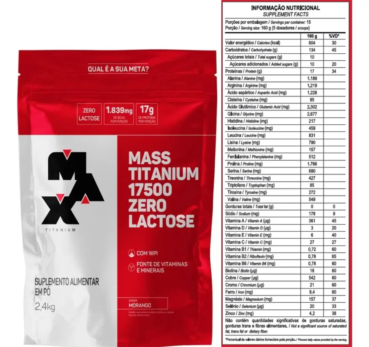 Mass Titanium 17500 Zero Lactose (2,4kg) Max Titanium é um hipercalórico completo e sem lactose! Combina três fontes proteicas de alta biodisponibilidade e digestibilidade e duas fontes de carboidratos. Sua fórmula conta ainda com vitaminas e minerais que contribuem para a metabolização dos macronutrientes.