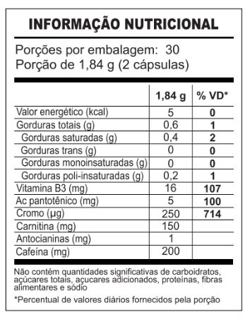 Óleo de triglicerídeos de cadeia média (TCM), óleo de cártamo, tartarato de L-carnitina, cafeína, nicotinamida, extrato de laranja moro (Citrus sinensis (L.) Osbeck), D-pantotenato de cálcio, picolinato de cromo. Cápsula: gelatina, glicerina e água purificada.