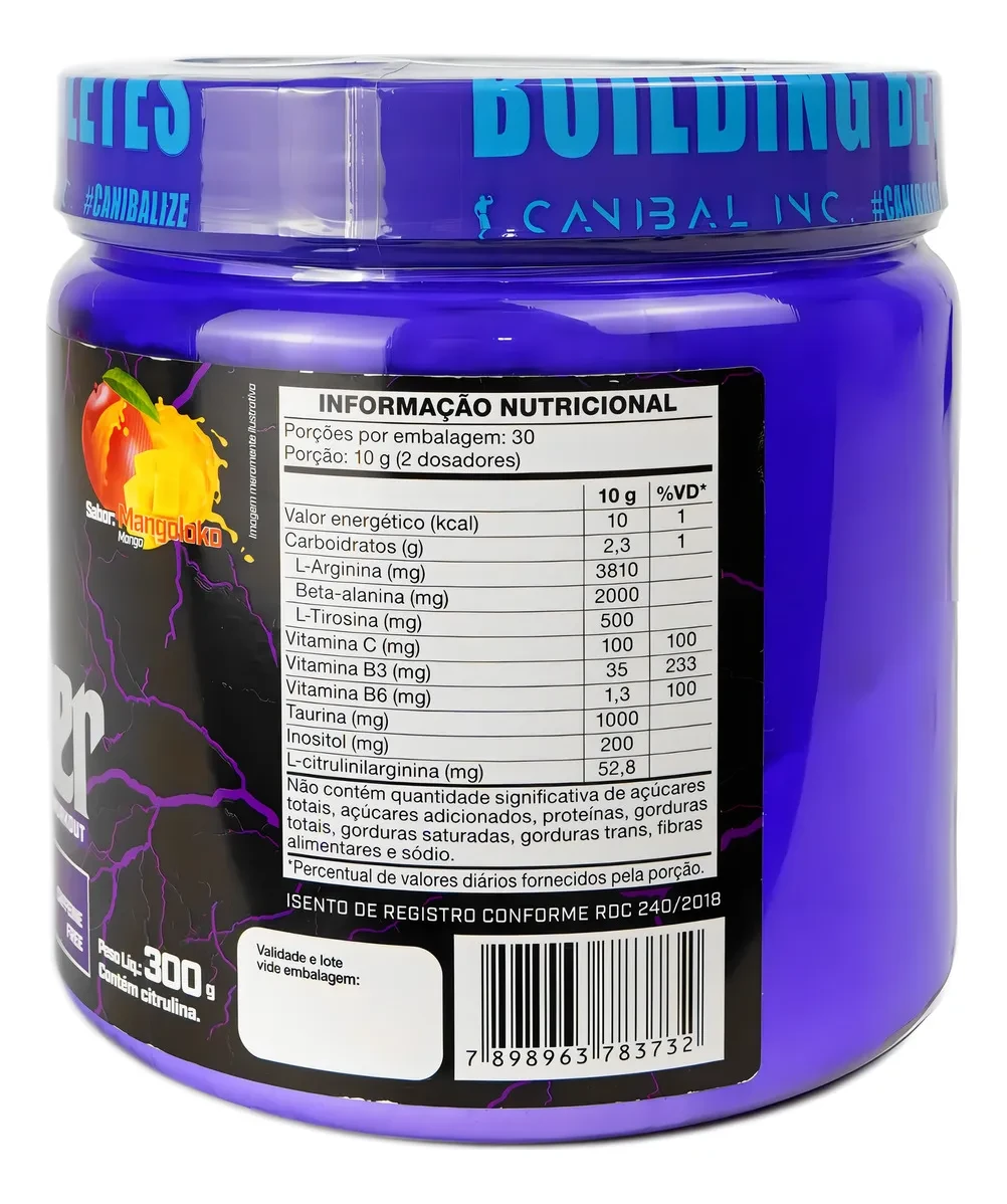 Mangoloko: CANIBAL PUMP BLEND(L-arginina, beta alanina, taurina, glicerol, Inositol, cloridrato de niacina (vitamina b3), ácido ascórbico(vitamina C), piridoxina HCL ( vitamina B6), pimenta preta, aroma idêntico ao natural de manga, corante amarelo tartrazina, antiumectante dióxido de silício, edulcorrante sucralose.