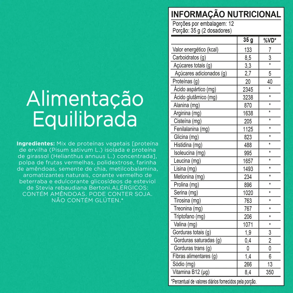 Mix de proteínas vegetais [proteína de ervilha isolada (Pisum sativum L.) e proteína de girassol concentrada (Helianthus annuus L.)], polidextrose, cacau em pó solúvel, farinha de amêndoas, semente de chia, metilcobalamina, aromatizantes e edulcorante glicosídeos de esteviol (estévia). ALÉRGICOS: CONTÉM AMÊNDOAS. NÃO CONTÉM GLÚTEN. Contém aromatizante.